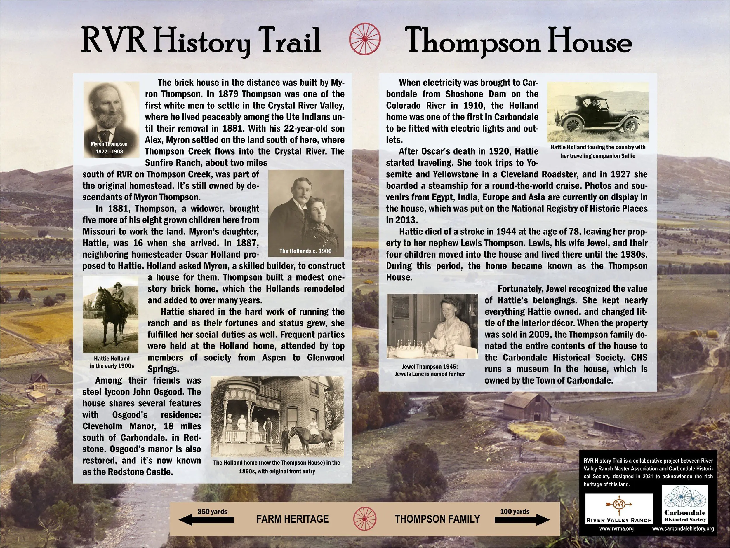 River Valley Ranch (RVR) and the Carbondale Historical Society created this project to acknowledge the rich history of the land that is now the RVR community. The trail is a 2.7-mile loop along a walking path. Ten descriptive panels tell the story of how the land evolved from the territory of the nomadic Ute Indian tribes in the 1400s, to the European settlers and homesteaders in the 1800s, to development of RVR homes and a golf course in the late 1990s.